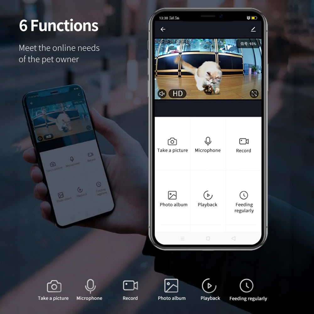 1080P HD Camera: Log in APP to know pet's situation at home, no worries when you go out, one-click online add meals and more interaction with the pet, the 2-way audio enables to hear and talk with your pet.